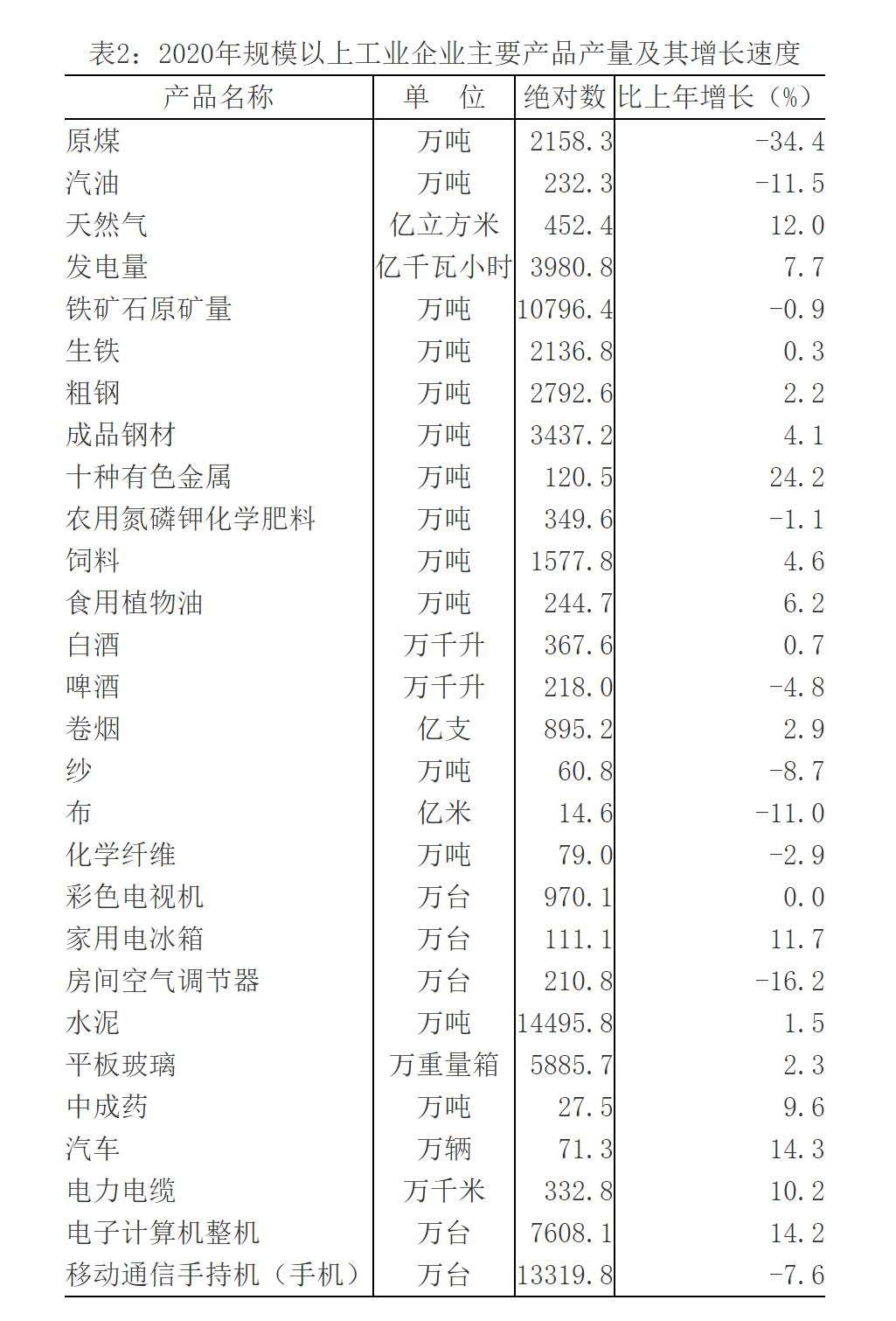 从主要产品产量看,原煤产量比上年下降34.4%,汽油下降11.5%,发电量增长7.7%,天然气增长12.0%,铁矿石原矿量下降0.9%,电子计算机整机增长14.2%,电力电缆增长10.2%,成品钢材增长4.1%,水泥增长1.5%,白酒增长0.7%,啤酒下降4.8%。全年规模以上工业企业产销率为98.2%。