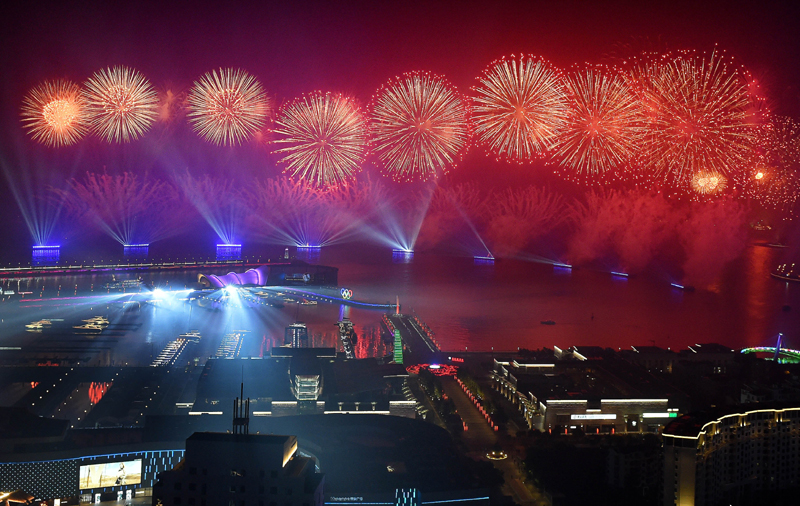 这是上合组织青岛峰会期间举行的《有朋自远方来》灯光焰火艺术表演(2018年6月9日摄)。新华社记者 李紫恒 摄
