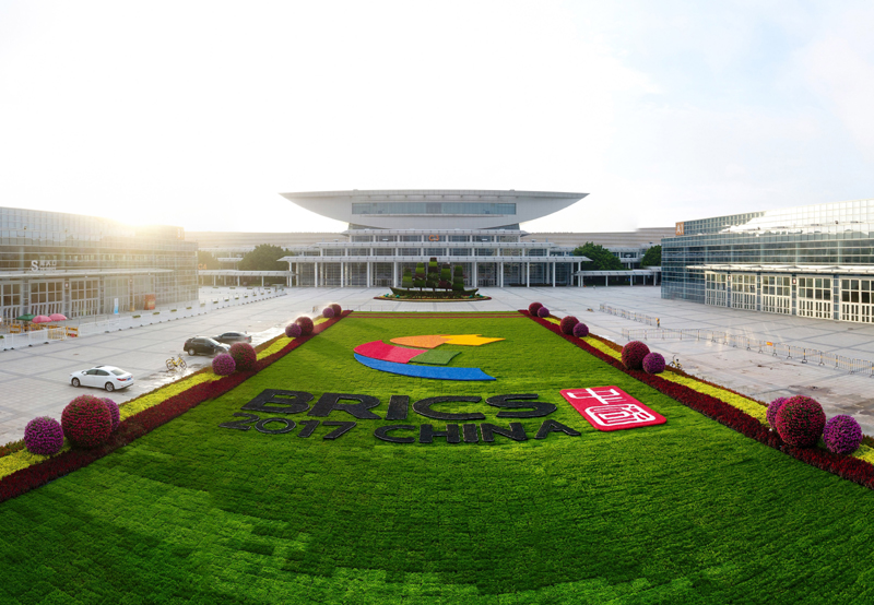 这是布置在厦门国际会展中心广场上的厦门会晤主题花坛(2017年8月24日摄)。新华社记者 姜克红 摄