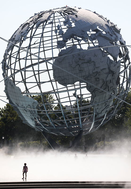 2021年8月13日,一名儿童冒着高温天气站在美国纽约科罗纳公园水雾广场的地球模型前。新华社记者 王迎 摄