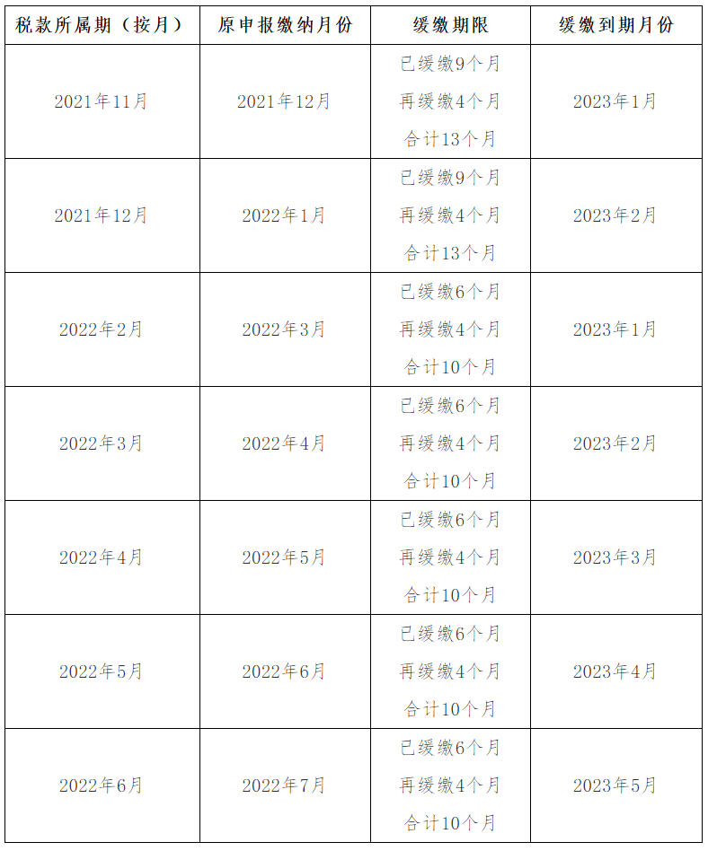 所属期是2022年2月、3月、4月、5月、6月(包括按季缴纳的2022年第一季、二季度税费)的缓缴税费在延长6个月的基础上继续延长4个月(合计延长10个月),分别在2023年1月至2023年5月入库。具体缓缴期限见下表: