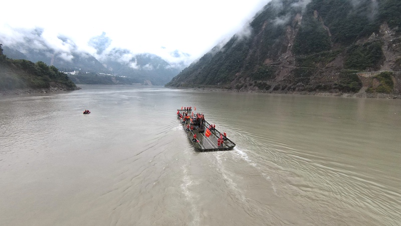 为了将大型机械设备快速运送到道路抢通关键点位,在四川省交通运输厅的统一部署下,四川省公路交通应急装备物资储备中心、蜀道集团联合开展应急抢险,抢建临时码头、开启水陆联运应急通道,投入16节动力舟桥拼接成动力船运载设备。
