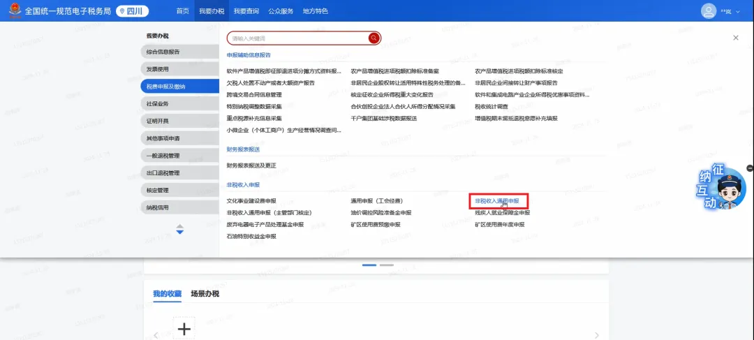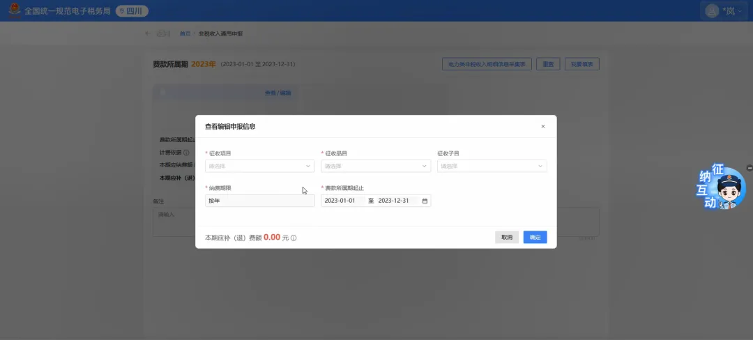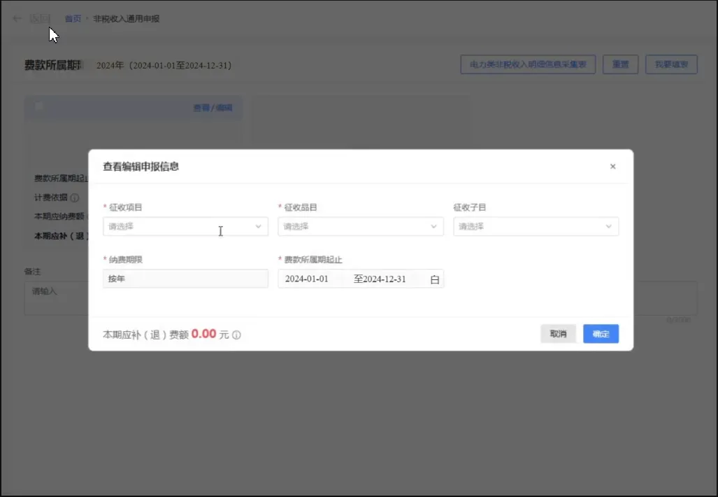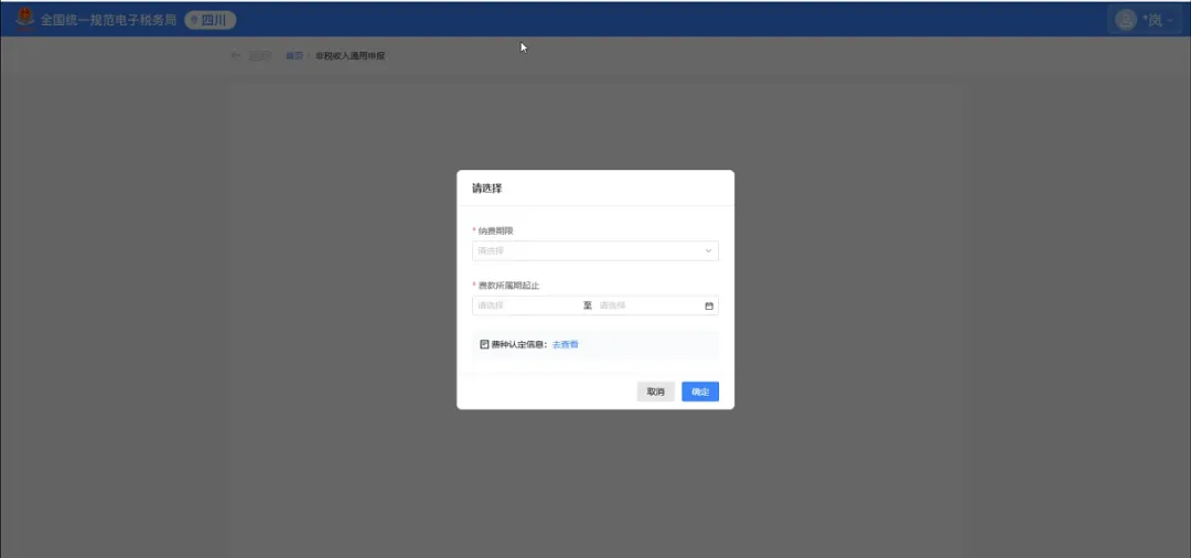1. 缴费人登录新电子税务局后,点击【我要办税】-【税费申报及缴纳】-【非税收入申报】-【非税收入通用申报】或【非税收入通用申报】(主管部门核定),或通过搜索栏搜索【非税收入通用申报】或【非税收入通用申报(主管部门核定)】,根据提示选择“纳费期限”(按收益率形式征收的矿业权出让收益、探矿权使用费、采矿权使用费选择“年”,按收益率形式征收的矿业权出让收益成交价部分、按金额出让方式征收的矿业权出让收益选择“次”),“费款所属期起止”选择需要缴费的年度(纳费期限按“年”征收的起止时间分别为当年的1月1日和12月31日,按次征收的为申报当天),点击“确认”进入申报页面。