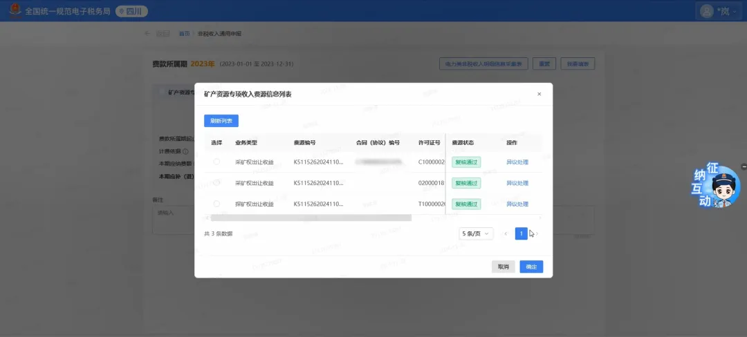 2. 进入申报页面,点击“查看/编辑”按钮 ,选择“征收项目—矿产资源专项收入”,系统自动带出矿产资源专项收入费源信息列表,缴费人选择需要申报的费源信息,点击“确认”。如对费源信息有异议,点击“异议处理”按钮,填写具体原因后退回主管部门处理。