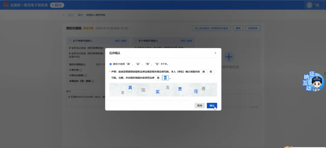 3. 缴费人对费源信息进行确认,确认无误后点击“提交申报”按钮,输入或依次选择“真”“实”“责”“任”四字,点击“确定”,即可完成申报。
