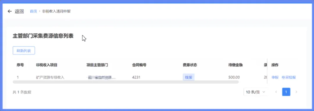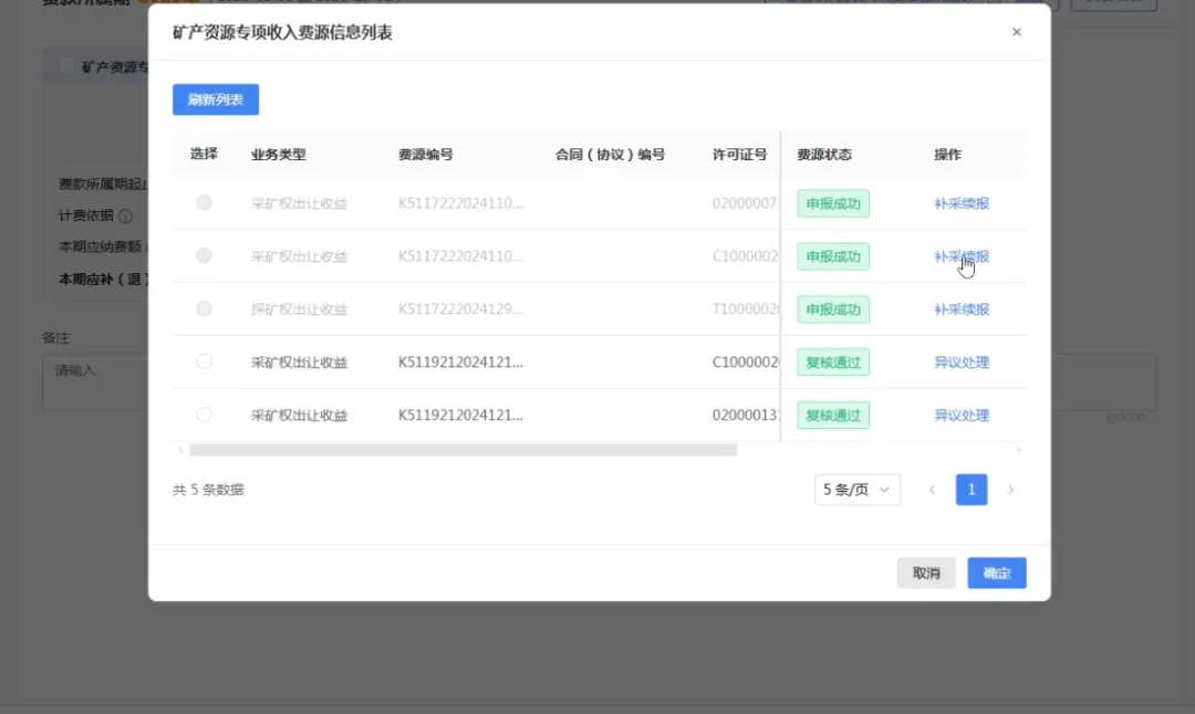 2.点击“查看/编辑”,征收项目选择“矿产资源专项收入”,点击费源信息列表的“补采续保”功能。