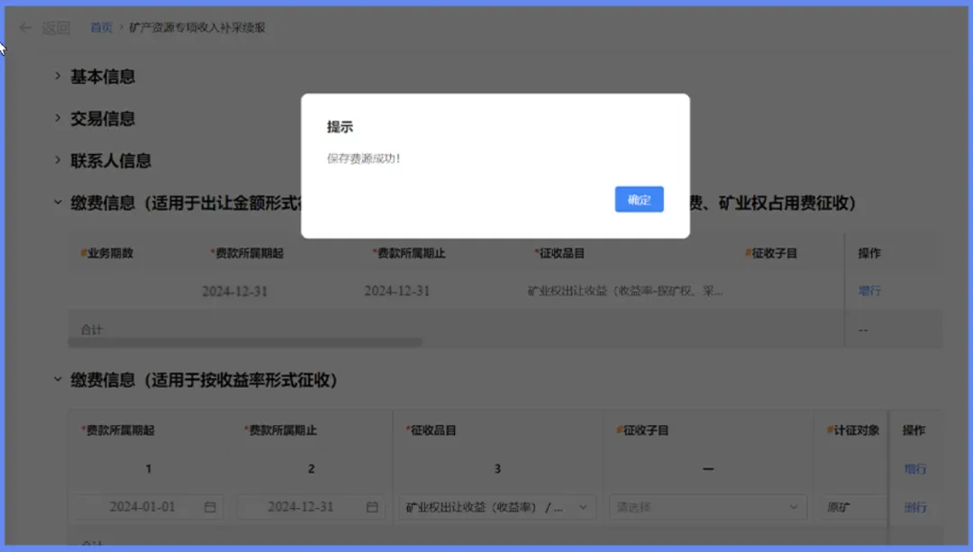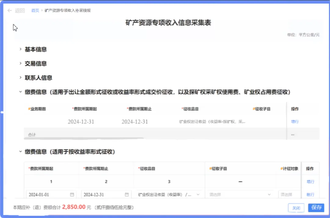 如果是探矿权使用费、采矿权使用费续报,应该在“缴费信息(适用于出让金额形式征收)”区域点击“增行”,录入探矿权采矿权使用费信息点击“保存”。