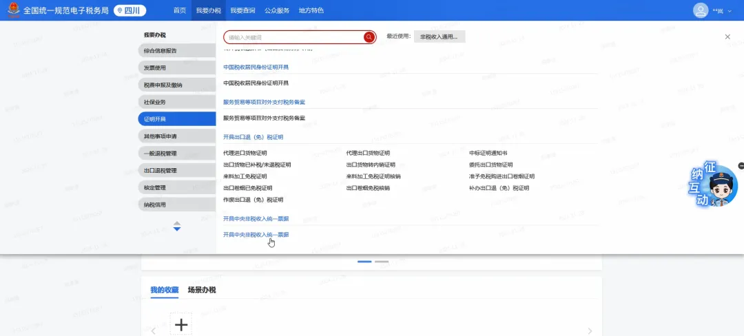 1. 缴费人登录新电子税务局后,点击【我要办税】-【证明开具】-【开具中央非税收入统一票据】-【开具中央非税收入统一票据】功能菜单。