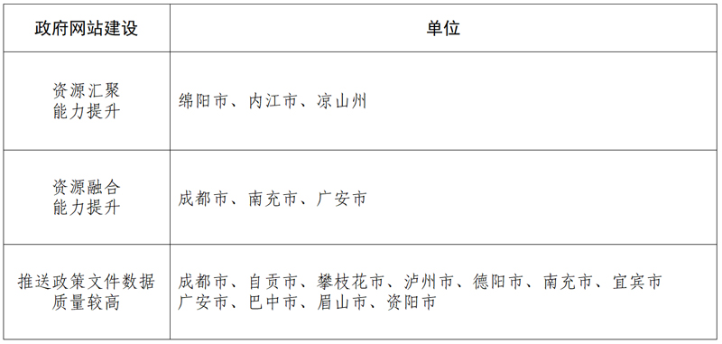 (一)汇集资源更加丰富。积极打通各平台数据库壁垒,实现政府信息、政府数据资源共通、共享、共用。省政府门户网站打造分类分级、集中统一、共享共用的政策文件库,目前已累计收集整理全省政策文件6.6万条,帮助企业和群众便捷、直观了解相关政策。成都市政府门户网站整合各类政务服务资源,集成15个应用场景,打造“蓉易+”品牌服务栏目,以数字赋能促进企业服务精准普惠。广安市政府门户网站整合信息资源,建立“民生服务专区”栏目,为群众提供8大主题40余个专项分类事项服务。住房城乡建设厅加强政务新媒体矩阵资源共享共用,以短视频、漫画图文等形式集中发布政策解读。省市场监管局整合微信、微博、抖音等多个平台资源,搭建“权威+时效+公众关切”的政务新媒体矩阵,为企业群众了解政策、办理业务提供便利。