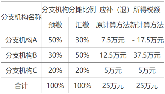 需要说明的是,汇总纳税企业如果不存在分摊税款计算不准确的情形,无论按原计算方法,还是按新计算方法,结果都是一样的。但是,若汇总纳税企业预缴环节未准确计算分摊税款,新计算方法可通过全量分摊方式,对全年分摊税款重新计算,实现多退少补。案例中,由于分支机构A和分支机构B在预缴环节分摊税款不准确,按新计算方法计算后,分支机构A在汇算清缴时应退税17.5万元,分支机构B应补税37.5万元,实现了对预缴未准确分摊税款的调整;由于分支机构C不存在分摊税款不准确的情形,无论按哪种方法计算,分支机构C在汇算清缴时均应补税5万元。