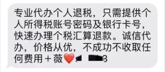 骗子会通过电话或者短信:“只要提供个税APP账号密码和银行卡号,我们就可以帮忙操作办理个税汇算退税,按退税到账金额比例支付服务费,若不成功不收取费用!”