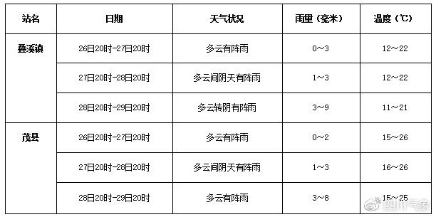 叠溪镇晚上到明天白天多云有阵雨(0~3毫米),明天晚上到28日白天多云间阴天有阵雨(1~3毫米);28日晚上到29日白天多云间阴有阵雨(3~9毫米)。