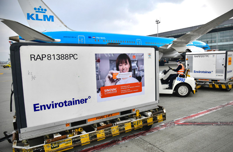 这是2021年3月6日在哥伦比亚波哥大埃尔多拉多国际机场拍摄的刚刚完成卸货的科兴疫苗。 新华社发(哥伦比亚总统府供图)
