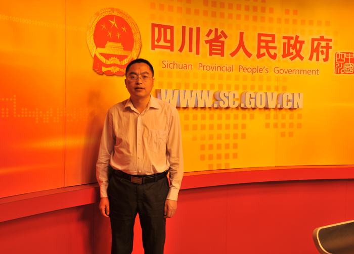 国土资源厅地质灾害应急管理办公室副主任曾凡伟同志接受四川省人民政府网站专访并与网友在线交流。图为曾凡伟参观省政府网站。
