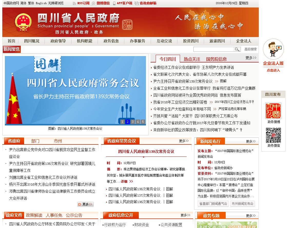 打开四川省人民政府网站,首先映入眼帘的是“人民在我心中、法治在我心中”这几个大字,然后下面有政务信息、办事服务、互动交流、企业法人等多个专栏,内容可谓丰富全面。作为政府机关面向公众的一扇窗口,四川省人民政府网站发挥着信息公开第一平台的作用,海量政务信息聚集一起,极大地方便公众查阅获取,增强了公开实效。