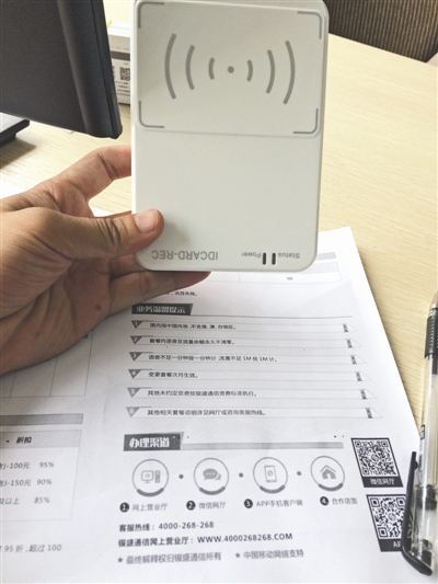“按照工信部的规定,买手机卡需要提供身份证,进行实名验证。”当记者咨询到办卡流程时,该公司招商总监杨洪说,实名制是办卡的前提。商洽间隙,他让工作人员将扫描身份证的两款仪器拿了进来。