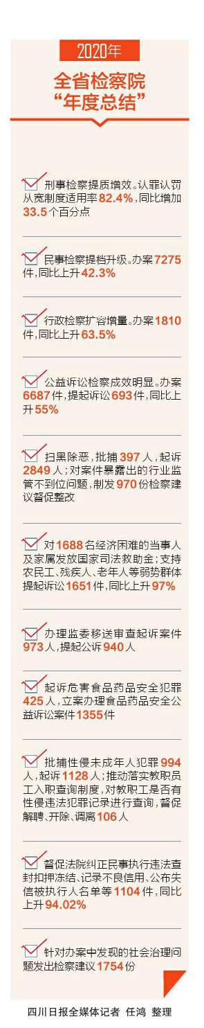 走过极不平凡的2020年,四川检察都做了哪些重点工作?四川省人民检察院工作报告从护航疫情防控和经济社会发展,努力提供更多更优检察服务,监督法律统一正确实施,着力打造过硬检察队伍,自觉接受监督等方面作了详细介绍。从办案数据看,去年,刑事检察提质增效,民事检察提档升级,行政检察扩容增量,公益诉讼检察成效明显。