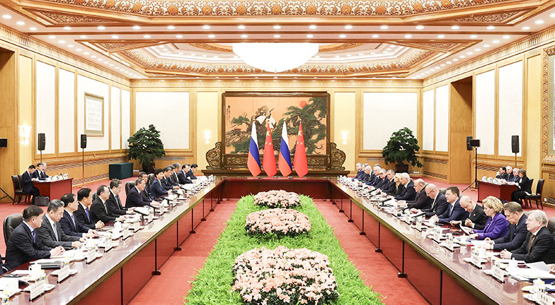 李强表示,在习近平主席和普京总统的战略引领下,中俄关系持续高水平运行,双方政治互信更加牢固,民间友好不断深化,务实合作更有韧性,国际协调更为密切,树立了新型大国关系典范。中方愿同俄方以明年两国建交75周年为契机,落实好两国元首重要共识,不断传承发扬中俄世代友好,推动中俄关系实现新的更大发展,持续增进两国人民福祉,给世界注入更多稳定性和正能量。