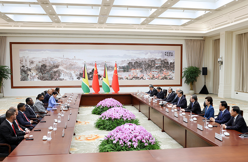习近平指出,中国和圭亚那虽然相距遥远,但友谊源远流长。圭亚那是加勒比地区最早承认一个中国原则并同新中国建交的国家。去年,中圭隆重庆祝了建交50周年。近年来,圭亚那经济快速发展,国家建设日新月异,中国正在以高质量发展全面推进中国式现代化。中圭两国要做彼此信赖、相互倚重的好朋友,共享机遇、共迎挑战、共谋合作、共促发展,推动构建更加紧密的中圭命运共同体。