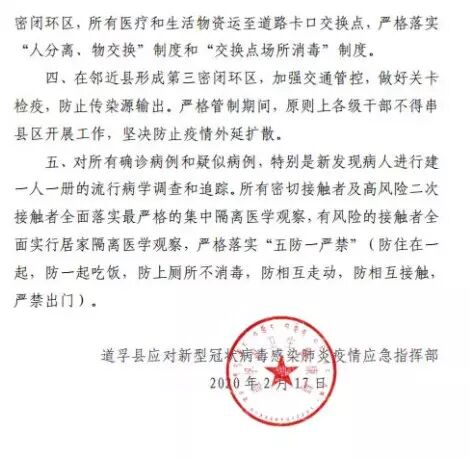 三、对道孚全县形成第二密闭环区,第二密闭环区实行“只进不出”,仅对医务人员、公安干警、行政管理等确有需要的人员进入,在进入封闭区时必须采取最严格的防护措施。进入第二密闭环区,所有医疗和生活物资运至道路卡口交换点,严格落实“人分离、物交换”制度和“交换点场所消毒”制度。