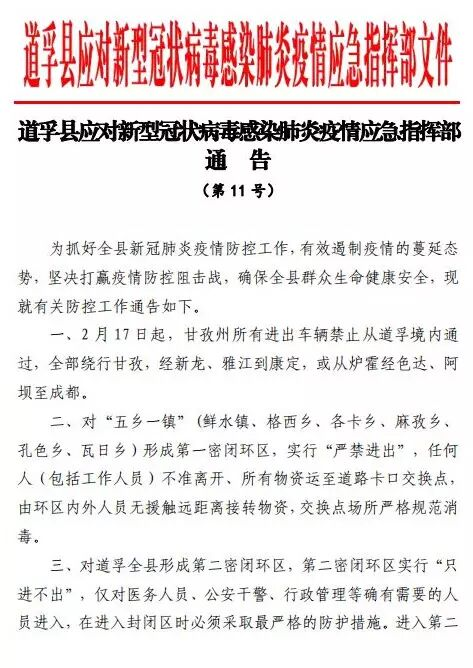 道孚县应对新型冠状病毒感染肺炎疫情应急指挥部发布公告,规定从2月17日起,甘孜州所有进出车辆禁止从道孚境内通过,同时从道孚县“五乡一镇”至邻县由内向外“划出”三个闭环区,分区分类实施科学防控措施。通告全文如下。