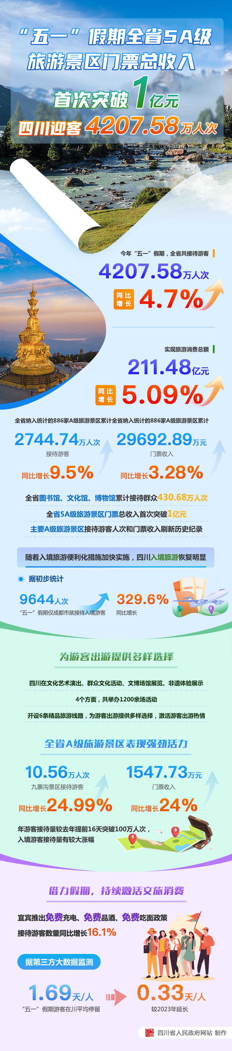 图解:“五一”假期全省5A级旅游景区门票总收入首次突破1亿元 四川迎客4207.58万人次