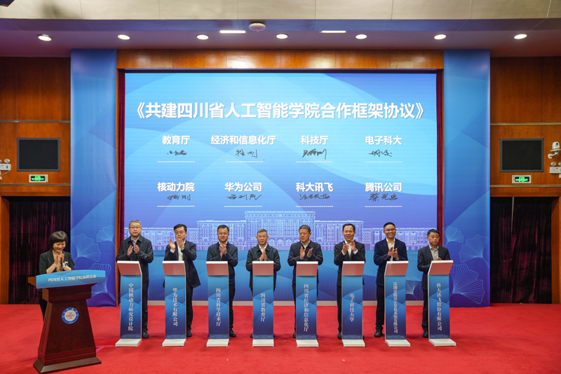 揭牌活动上,副省长郑备讲话,教育厅负责同志宣读《四川省教育厅关于同意成立四川省人工智能学院的批复》,教育厅、经济和信息化厅、科技厅、电子科技大学与华为、腾讯、科大讯飞、核动力院等企业及科研院所签署共建协议。随后,黄强和电子科技大学负责同志共同为四川省人工智能学院揭牌。