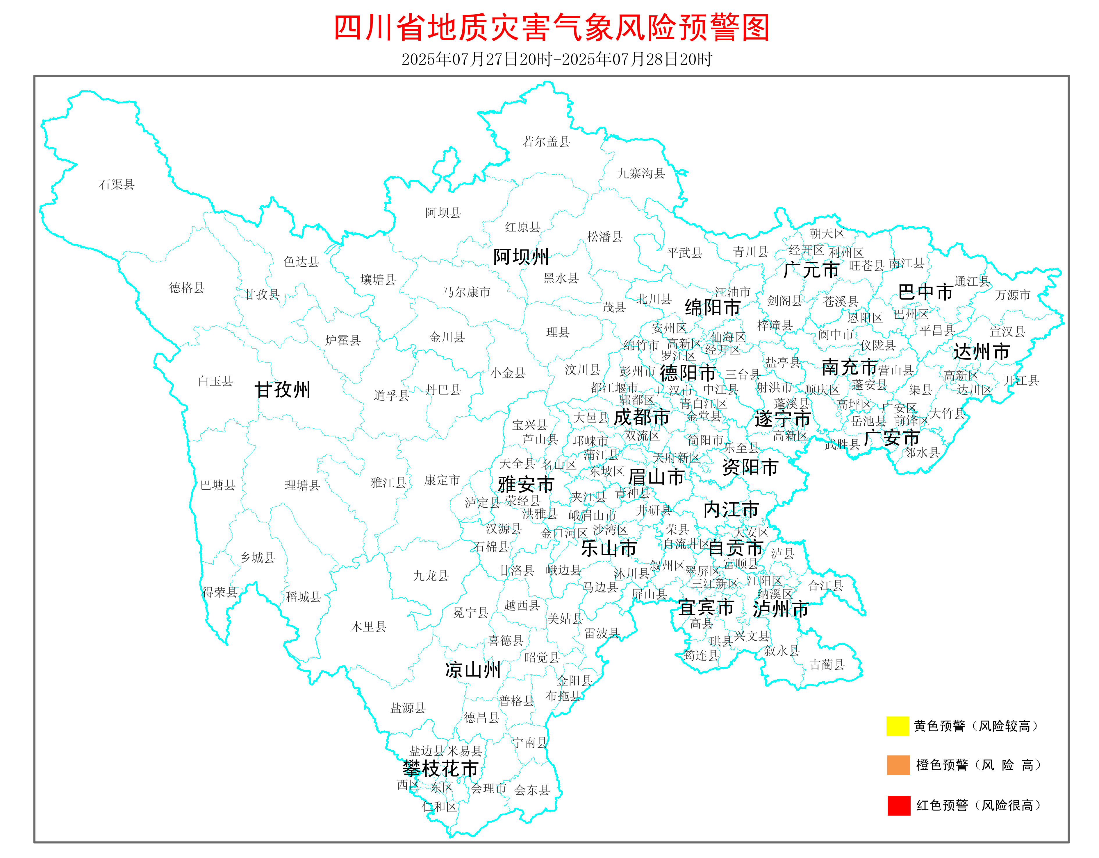 2025年07月27日20时-2025年07月28日20时,无省级地质灾害预报区。请各地结合当地气象部门天气预报和降雨实况,及时发布预警信息,做好地质灾害防范工作。