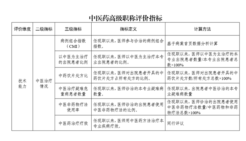 1.收治患者CMI值大于本单位本专业同职称医师年平均值;中医药治疗情况:门诊患者中药饮片处方比不低于70%,出院患者中医为主治疗数量比例不低于19%,中医药治疗疗效好,且患者满意度大于95%(限医师类)。