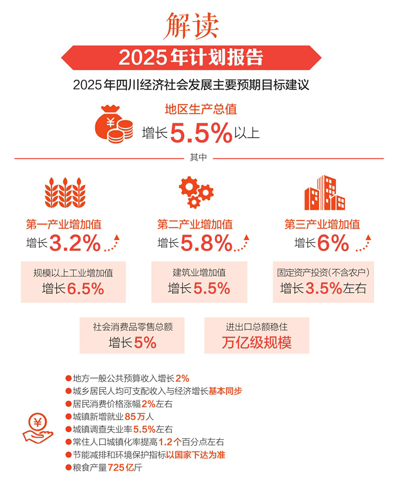 1月20日,省十四届人大四次会议在成都开幕。省发展改革委作了《关于四川省2024年国民经济和社会发展计划执行情况及2025年计划草案的报告》(以下简称《计划报告》),提出2025年度各项计划安排建议,其中包括地区生产总值增长5.5%以上的预期目标建议等。