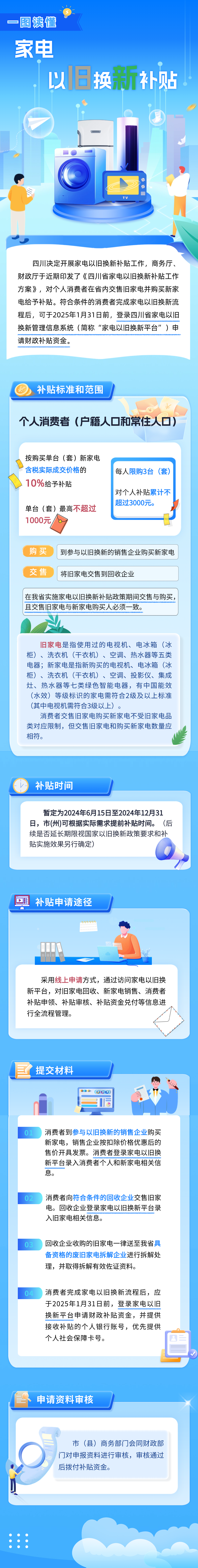 家电:对2024年6月15日至2024年12月31日,个人消费者在四川省内以旧换新购买电视机、电冰箱(冰柜)、洗衣机(干衣机)、空调、投影仪、集成灶、热水器七类绿色智能电器,且将旧家电交售到回收企业的,可按购买单台(套)新家电含税实际成交价格的10%给予补贴,单台(套)最高不超过1000元,每人限购3台(套),对个人补贴累计不超过3000元。需注意的是,交售旧家电与购买新家电的购买人必须一致。(注:家电补贴政策后续是否延长期限,视国家以旧换新政策要求和补贴实施效果另行确定。)