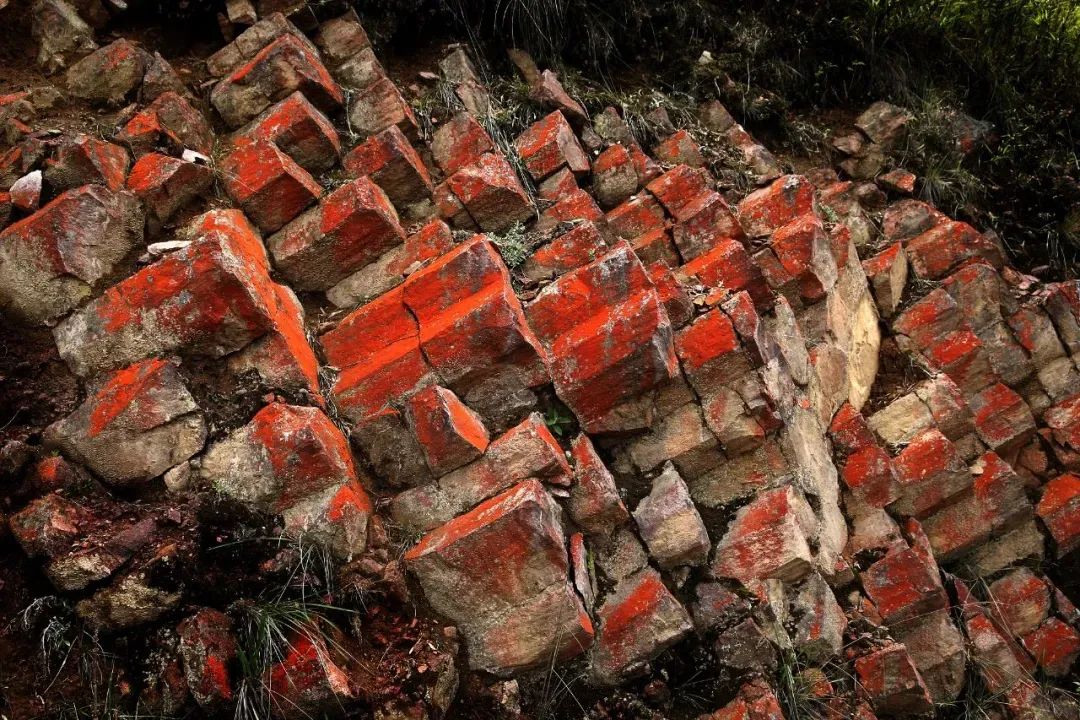 峨眉山玄武岩形成的柱状节理,表面为红色藻类植物。(李忠东 摄)
