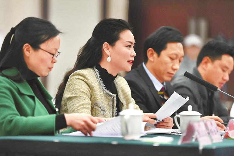 1月14日下午,在乐山代表团小组讨论会上,曹红英代表(左二)在发言。