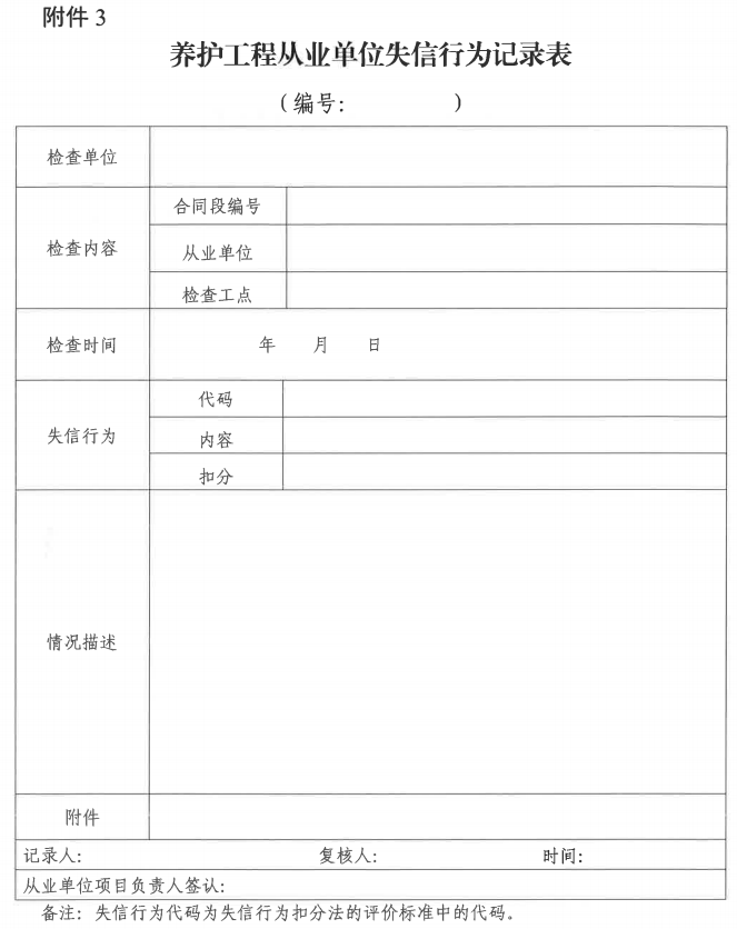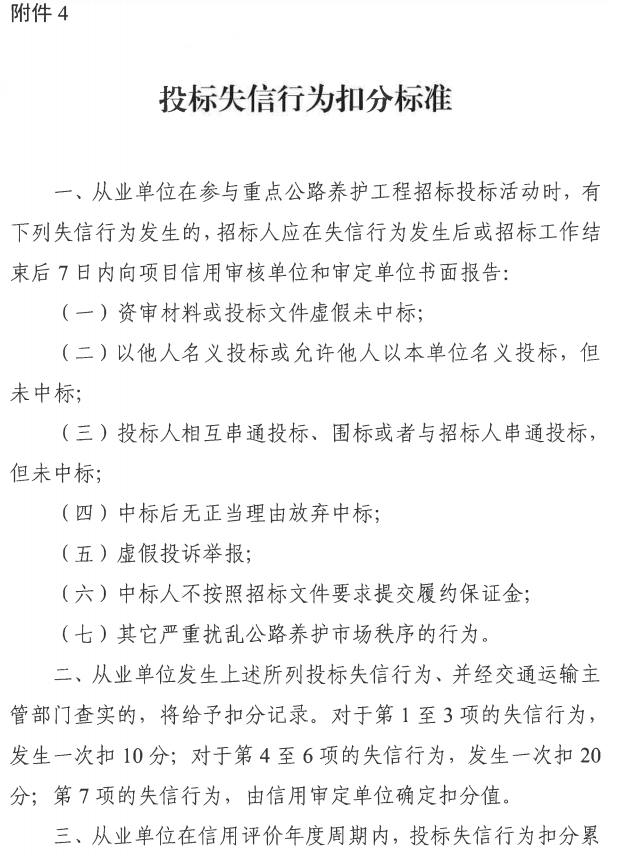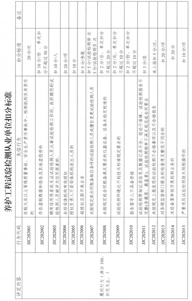 第二十六条 重点公路养护市场的勘察设计、养护施工、养护施工监理和试验检测等从业单位承包合同段履约行为的信用评价采用失信行为扣分法(标准见附件2)。