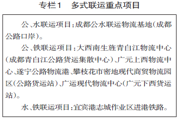 (一)多式联运工程。加快多式联运设施建设,构建能力匹配的集疏运通道,配备现代化中转设施,实现货运换装无缝衔接。大力发展与航班直接接驳的联程公路班车、铁路班列,实现航空货流无缝衔接。实现“蓉欧快铁”双向常态化稳定运行,推动开行成都与东部沿海城市间的直达电商专列。支持和促进蓉(渝)穗、蓉沪“铁水”联运班列增收上量,支持“蓉亚班列”开行,打造成都通往中亚各国的铁路国际联运新通道。推进成都至泸州、泸州至昆明、泸州至攀枝花等“铁水”联运班列双向稳定运行,开通成都至广西北部湾“海铁”联运“五定班列”,做好开通成都经昆明至仰光“海铁”联运“五定班列”的前期工作。开通成都至宜宾港、泸州港、重庆港集装箱城际货运班车,形成成都至长三角“公铁水”联运通道。
