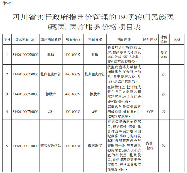 附件:1.四川省实行政府指导价管理的19项转归民族医(藏医)医疗服务价格项目表