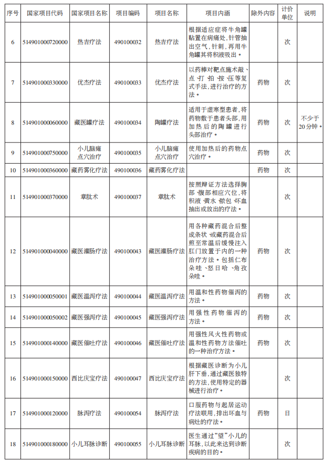 二、“札梅”等19项医疗服务价格项目实行政府指导价管理(详见附件1),各市(州)医保局可根据当地医疗水平、医院等级和经济状况,在医疗机构具备开展相应诊疗项目资质的情况下,严格按照本通知规定的项目编码、名称、内涵、除外内容、计价单位及说明等,拟定辖区内公立医疗机构民族医(藏医)医疗服务价格项目收费标准。