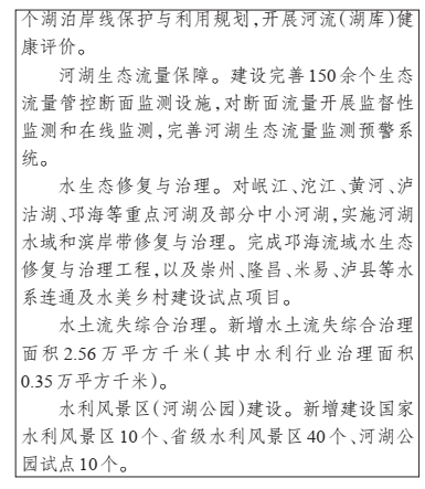 ——水生态得到有效保护。河湖长制深入推进,涉水空间管控得到加强,流域面积1000平方千米以上河流和常年水面面积1平方千米以上湖泊岸线保护与利用规划全面完成,江河湖库水源涵养与保护能力明显提升。重点河湖生态流量保障目标满足程度达90%以上,水生态环境状况明显改善。人为水土流失得到基本控制,重点地区水土流失得到有效治理,全省水土保持率提高到78.5%以上。