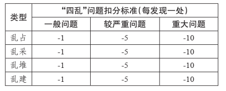 指标解释:指行政区域内河湖岸线乱占、乱采、乱堆、乱建等“四乱”问题发生情况。“四乱”扣分时应考虑其严重程度,扣完为止,如下表所示。