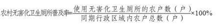 指标解释:指使用无害化卫生厕所的农户数占同期行政区域内农户总数的比例。无害化卫生厕所指按规范建设,具备有效降低粪便中生物性致病因子传染性设施的卫生厕所,参照《关于进一步推进农村户厕建设的通知》(全爱卫办发〔2018〕4号)执行。包括三格化粪池厕所、双瓮漏斗式厕所、三联通式沼气池厕所、粪尿分集式厕所、双坑交替式厕所和具有完整上下水道系统及污水处理设施的水冲式厕所等。