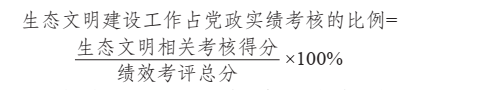 指标解释:指创建地区本级政府对乡(镇)人民政府党政干部实绩考核评分标准中,生态文明建设工作所占的比例。包括生态文明制度建设和体制改革、生态环境保护、资源能源节约、绿色发展等方面。县级行政区要对乡镇党政领导干部考核。该指标旨在推动创建地区将生态文明建设工作纳入党政实绩考核范围,通过强化考核,把生态文明建设工作任务落到实处。