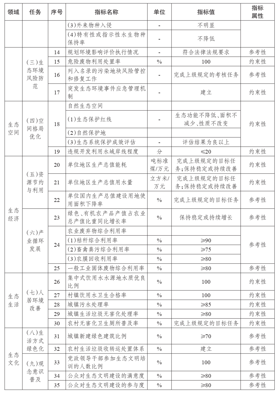 (三)经自查,省级生态县建设指标中约束性指标全部达到考核要求,参考性指标达标率大于80%。