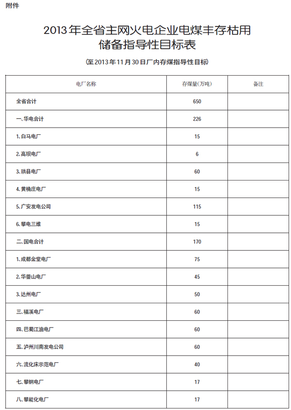 附件:2013年全省主网火电企业电煤丰存枯用储备指导性目标表