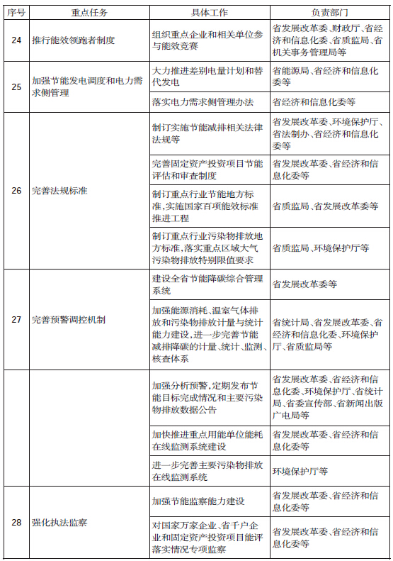 (三十一)明确相关部门责任。省政府有关部门要按照职责分工,加强协调配合,多方齐抓共管,形成工作合力。省发展改革委要履行好省节能减排及应对气候变化工作领导小组办公室职责,会同环境保护厅等有关部门加强对地方和企业的监督指导,抓紧制订对进度滞后地区的帮扶督办方案,密切跟踪工作进展,督促行动方案各项措施落到实处。环境保护厅等要全面加强监管,其他各相关部门也要抓紧行动,共同做好节能减排降碳工作。