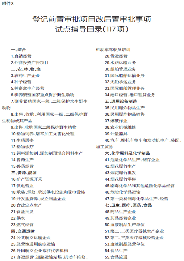 3.登记前置审批项目改后置审批事项试点指导目录(117项)