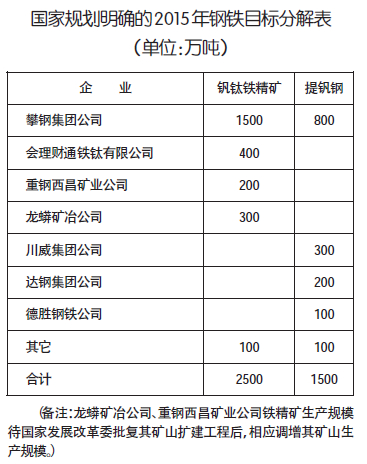 ——调整产业产品结构。钛产业重点发展氯化法钛白、高档专用钛白等高端产品,加快发展钛合金及钛材等,积极开发大飞机制造及航空航天、海洋工程及船舶制造、医疗器械、高端消费品等系列钛合金材料及深加工制品。钒产业稳步提高冶金用钒规模水平,重点开发钒电池、高品质钒钢等,大力发展钒铝合金、氧化钒薄膜材料等。提高钒钛磁铁矿伴生金属的分离、提取及深加工规模化、产业化水平。积极推进稀土冶炼企业兼并重组,发挥攀西水电优势,建设规模化现代化火法冶炼生产装置,大力提高稀土深加工和应用水平。提钒钢控制在国家核定的规模内(国家规划攀西地区2015年为1500万吨)。大力发展以汽车零部件为代表的钒钛铸造及装备制造等。推进碲铋矿开发利用,重点发展碲化镉薄膜太阳能电池等。