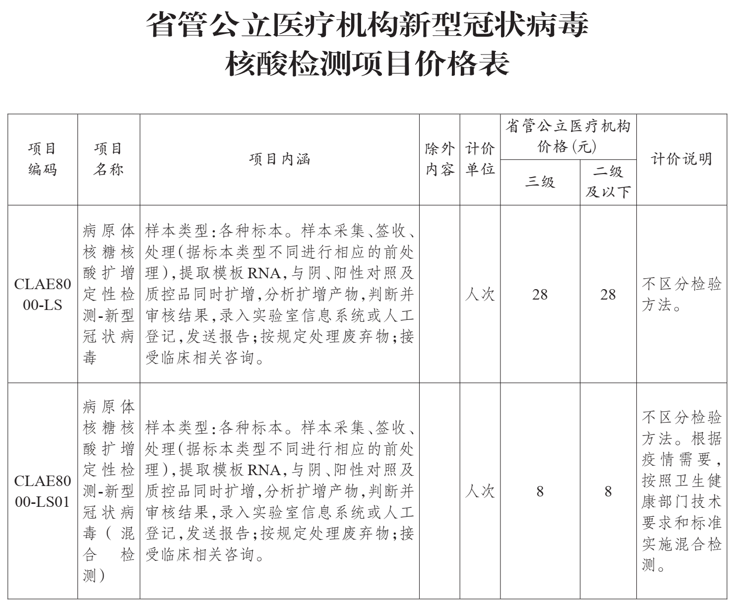 附件:省管公立医疗机构新型冠状病毒核酸检测项目价格表