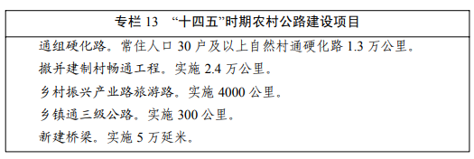 农村公路。实施撤并建制村畅通工程,实现有条件地区农村公路成网成环。实施乡村振兴产业路旅游路工程,提升乡镇对外畅通能力,支撑中心城镇培育。实施自然村通硬化路工程,扩大农村公路覆盖范围和通达深度。新建一批农村公路桥梁,建设通寺庙公路和森林防灭火道路。推进“四好农村路”示范创建提质扩面,争创“四好农村路”全国示范市和示范省,支持广安、遂宁等与重庆毗邻地区共建“四好农村路”示范区。