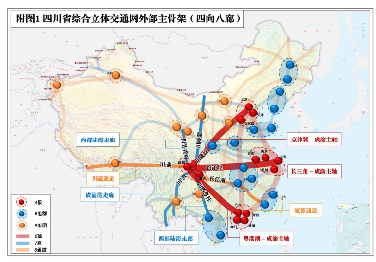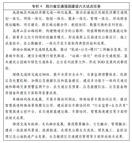 到2025年,交通强省建设取得重大突破。初步建成“四向八廊”战略性综合交通走廊和成渝地区双城经济圈国际性综合交通枢纽集群,基本形成“123出行圈”和“123快货物流圈”,基本实现“快速网覆盖区县、干线网畅达乡镇、基础网连接村组”,为打造全国交通“第四极”奠定坚实基础。