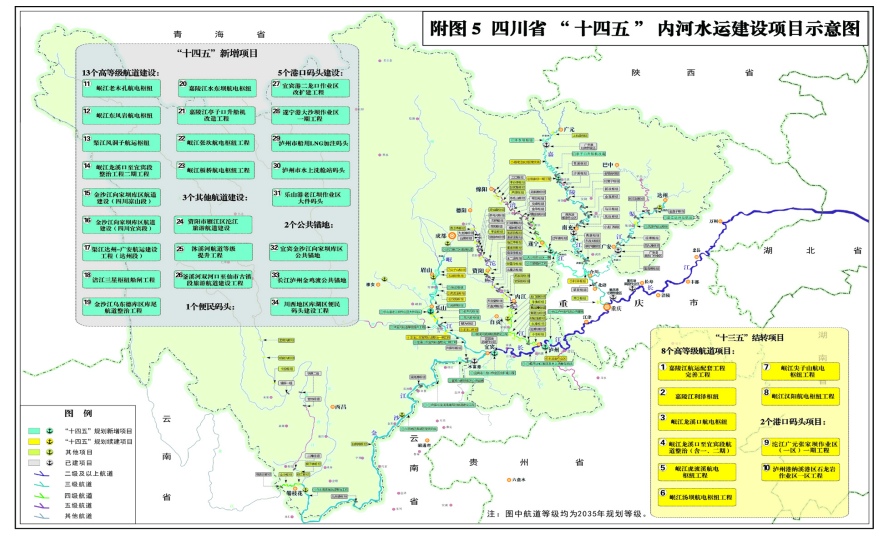 内河水运。制定“一江一策”实施方案,加快构建“一横五纵多线”航道网,协同推动长江干线航道扩能提升,有序实施嘉陵江、岷江、渠江航道梯级建设和航道整治,推动岷江全线达标、嘉陵江全线复航、渠江全线渠化,加强金沙江翻坝转运系统建设和库区航道整治,推动沱江、涪江下段与长江下游干支衔接,加强老旧船闸改造。深入推进全省港口资源整合,加快完善“两核四翼多点”港口体系,推进泸州港、宜宾港、乐山港一体化发展,推动广元港、南充港、广安港融入重庆港,加强专业化、规模化、现代化港区建设,完善公共锚地、水上服务区等设施。因地制宜建设旅游客运码头和库区便民码头。